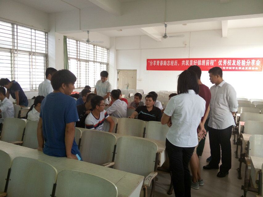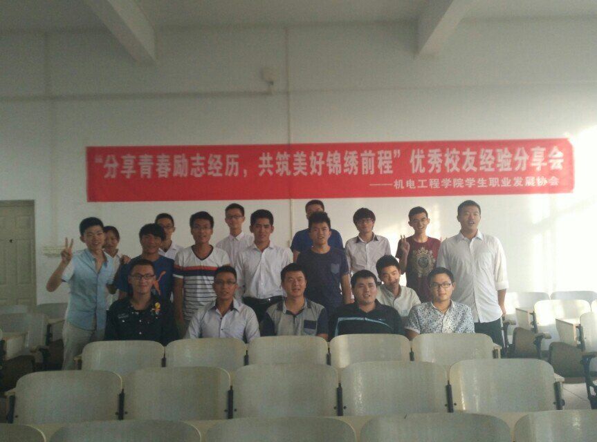 2015年11月12日,由必赢626net入口首页职业发展协会承办的必赢626net入口首页优秀校友经验分享会在必赢626net入口首页3号教学楼405教室举行。受邀参加本次分享会的优秀校友有:一汽海马汽车有限公司安全环保科科长柴长友(必赢626net入口首页2002级电气专业)、一汽海马汽车有限公司车身设计工程师钟高登(必赢626net入口首页2009级车辆工程)。出席此次分享会的有崔建兵老师,以及近40名同学们参加了此次分享会。