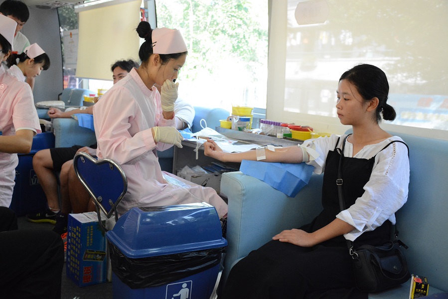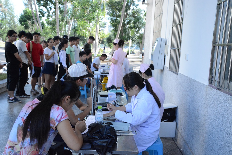 上午九时,献血活动开始。为了保障献血者的安全,我院青年志愿者协会协助海口市血液中心工作人员开始了一系列检查工作,工作人员悉心为大家讲解献血有关注意事项,耐心询问捐献者的具体情况,并帮助他们填写表格,同学们积极配合,严格遵守献血秩序,在几番严格审核下,医生给符合要求的同学进行了抽血工作。