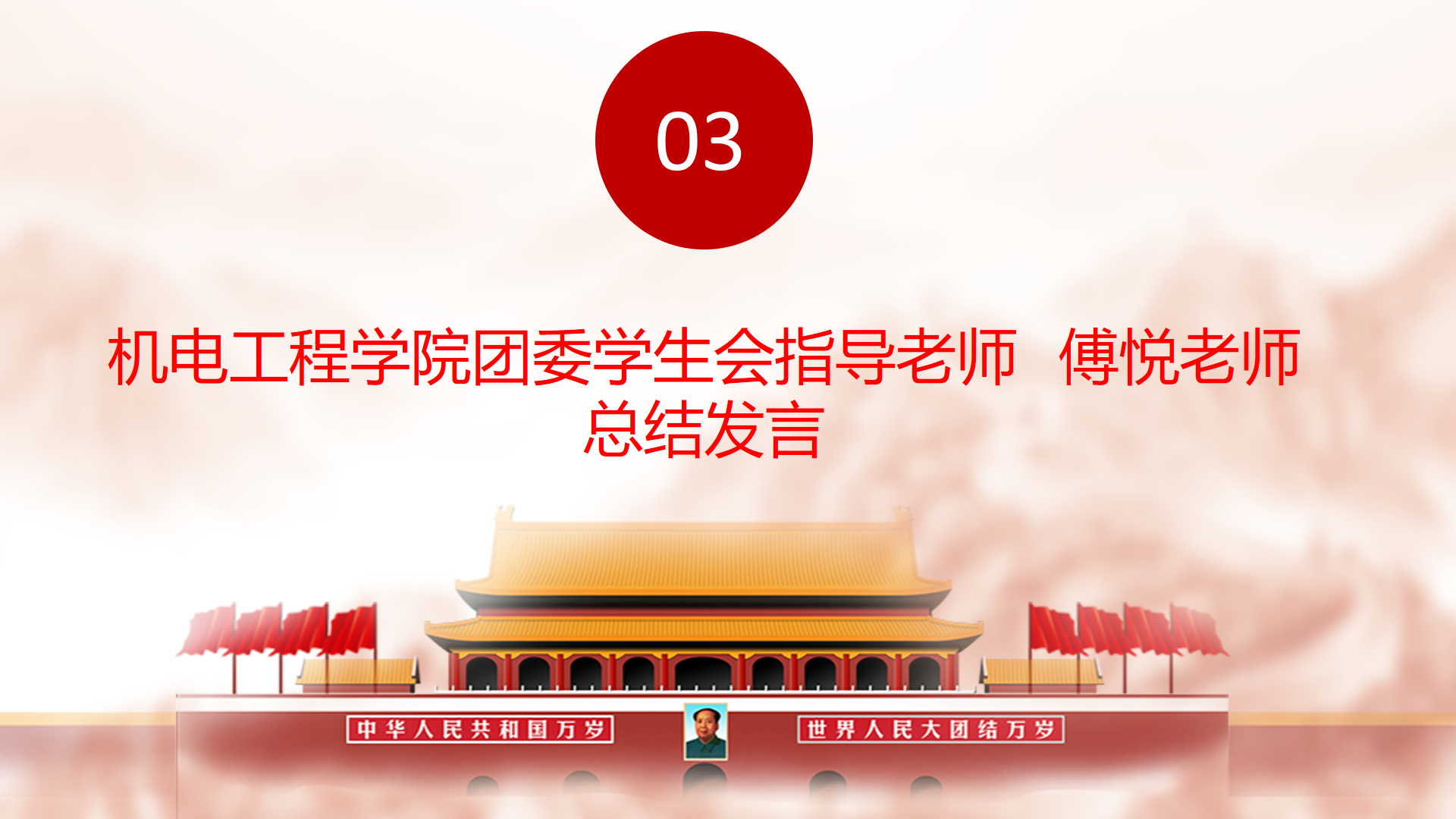 活动的最后,机电团委学生会的指导老师傅悦老师做了总结讲话。她表以抗日战争、朝鲜战争中为国捐躯的青年,以及上世纪60年代在戈壁滩为祖国研究两弹一星的党员青年为例,希望当代青年能够学习榜样的力量,能够在国家需要的时候站出来,成为国家的脊梁。她希望我们机电的学子们能够了解这个世界,认识中国所处的位置,在中华民族艰苦奋斗过程体会中华民族的伟大与美好。最后,傅悦老师祝愿必赢626net入口首页的学生们五四青年节快乐,并表达了希望我们向上想好,为中华民族伟大复兴的中国梦而努力奋斗。