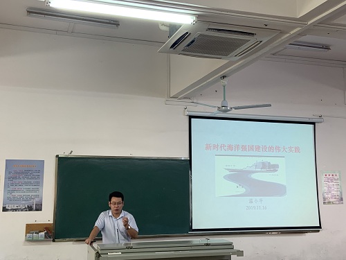 讲座伊始,温小平教授以“从康乾盛世到鸦片战争的40年”、“改革开放以来的40年”为引,结合中国近代历史事件,提出中国屈辱历史是以海上失利为开端,新时代要实现中华民族伟大复兴必须加强海洋建设。从党的十八大开始,国家积极推进海洋强国建设,坚持陆海统筹,推进海洋行政管理创新,加快建设海洋强国。温小平教授通过对“海洋强国”内涵的剖析,拓展了同学们对海洋的认识,增强了同学们的国防意识。