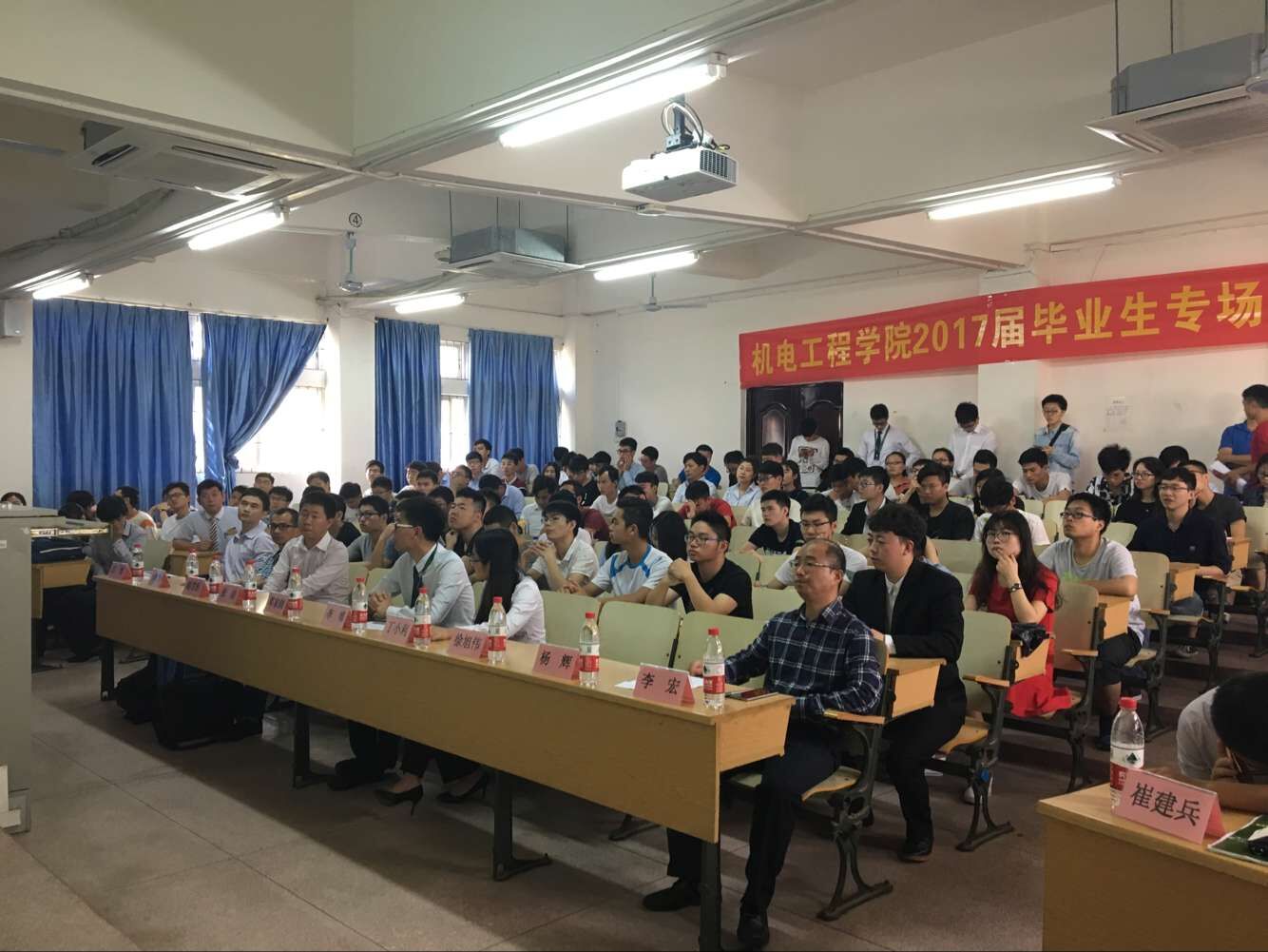 2017年3月14日上午,必赢626net入口首页2017届毕业生第四场专场招聘宣讲会在2教110成功举办。出席招聘宣讲会的有我院党委副书记李宏、学工办主任崔建兵,8家用人单位人事部主要负责人,2017届毕业生及机电职协干部等150人参加。宣讲会由校园大使部任海琪主持。