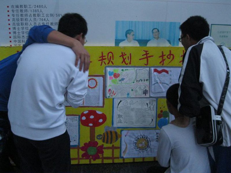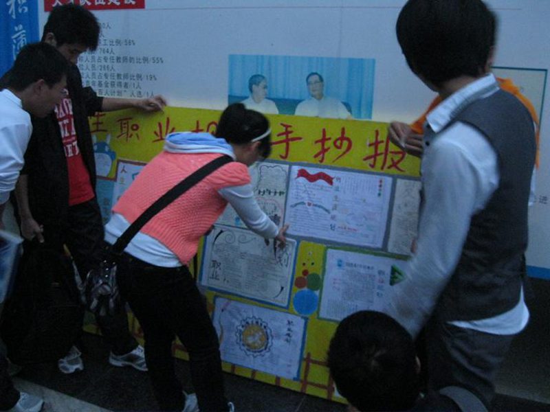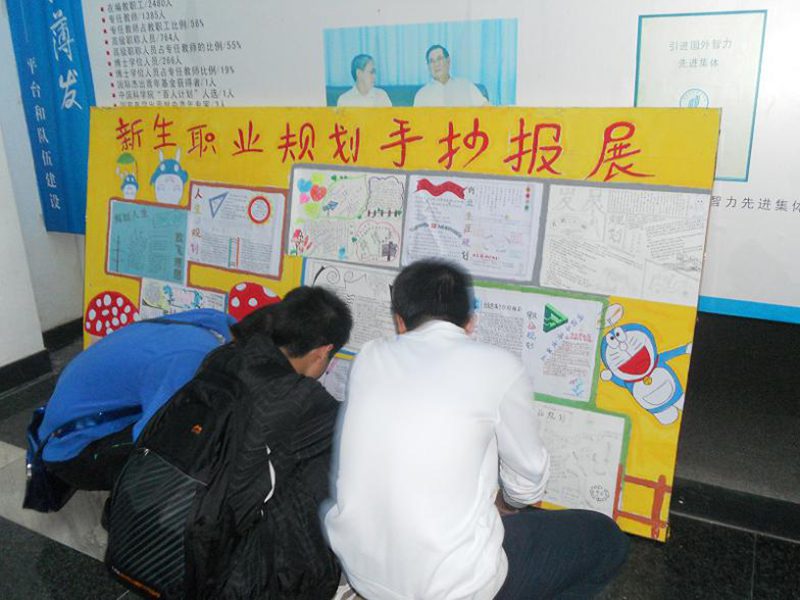 2011年11月20日,我院在3号教学楼前展出2011级新生“我画我规划”职业规划手抄报优秀作品,引来学子们饶有兴趣地驻足观看。