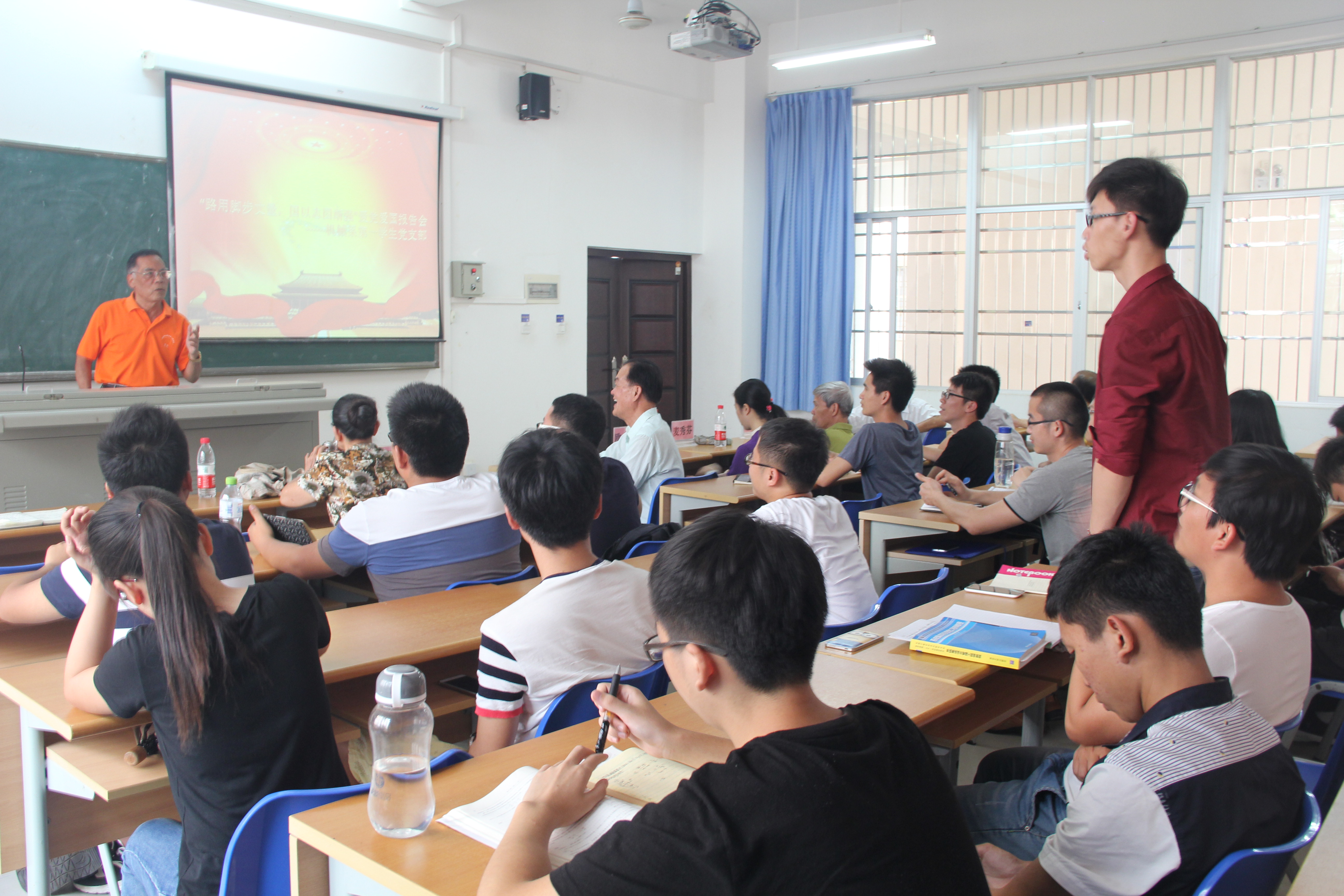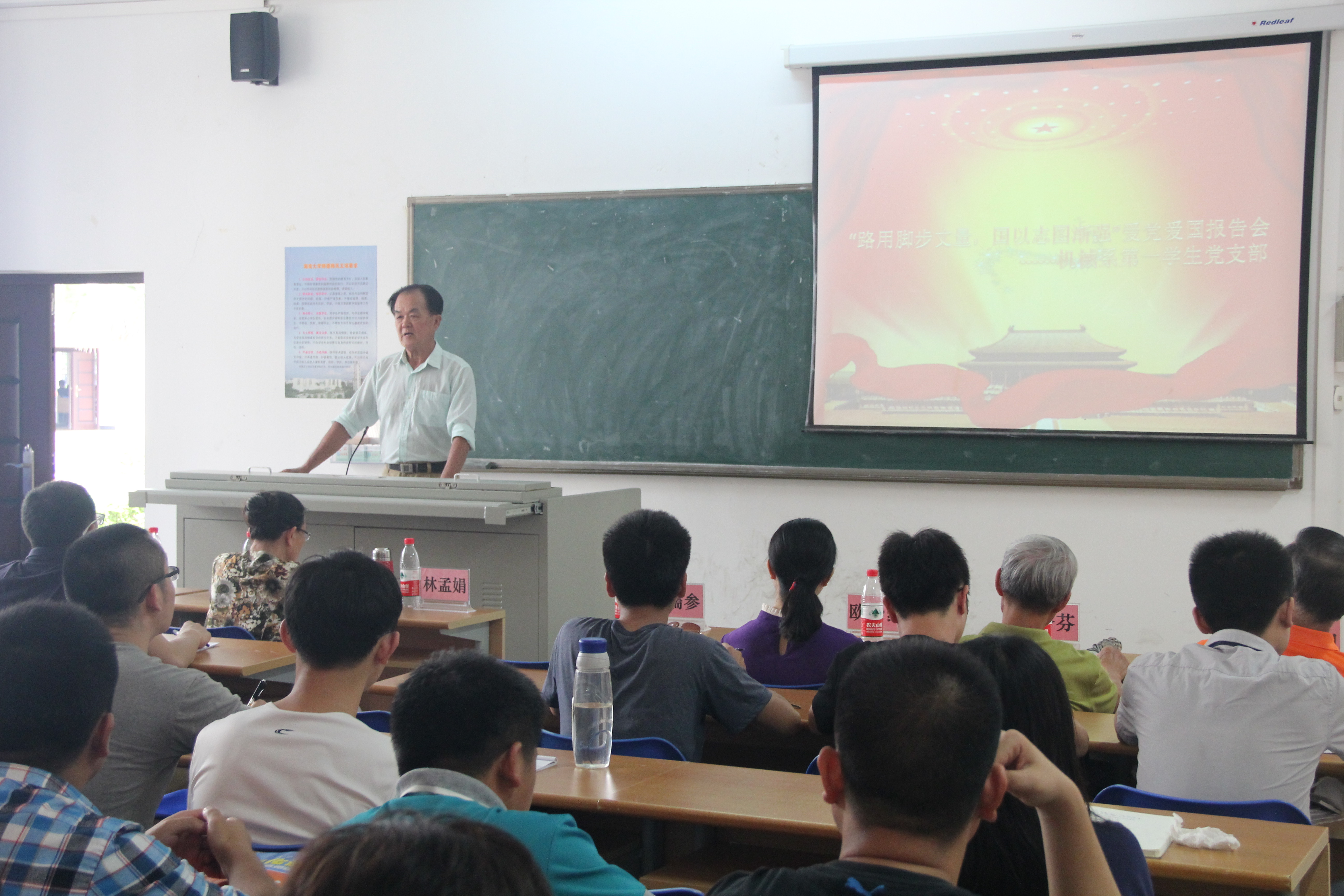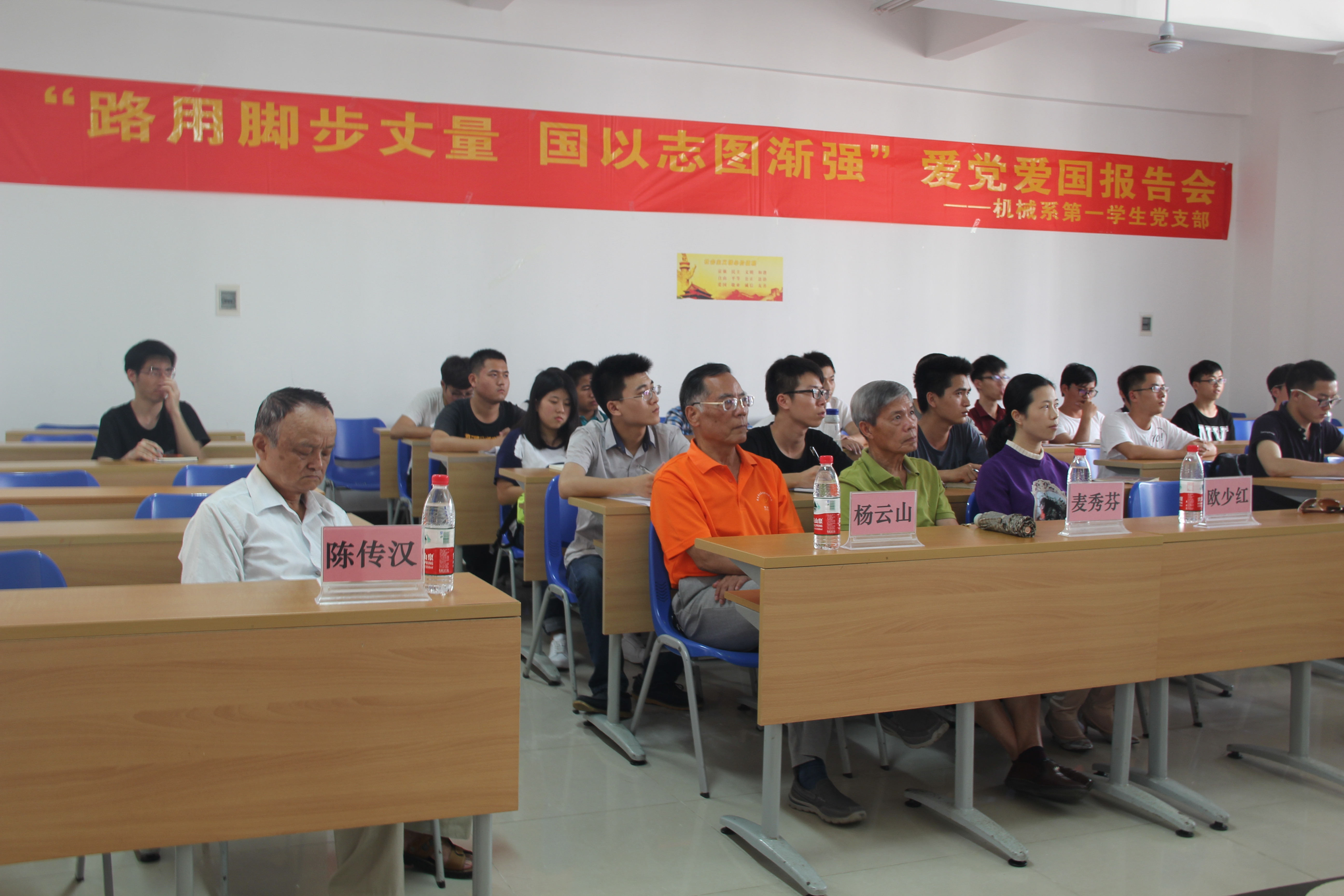 为了积极响应党中央“学党章党规、学系列讲话,做合格党员”的“两学一做”学习教育号召,加强学生党员的党性修养建设。必赢626net入口首页机械系第一学生党支部于四月十五日下午在4-109隆重举行主题为“路用脚步丈量,国以志图渐强”的爱党爱国报告会,出席报告会的有必赢626net入口首页关工委、党史国史宣讲团成员程儒参、杨云山、陈传汉、麦秀芬、林孟娟老师,必赢626net入口首页党委李宏副书记,信息科学与技术学院党委会秘书欧少红,机械系第一学生党支部书记崔建兵,参支部党员、入党积极分子约40人参加本次活动。报告会由宣传委员金杯主持。