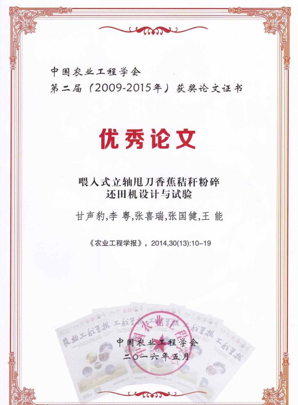 近日,我院热带作物秸秆机械化技术课题组两篇《农业工程学报》论文入选“中国农业工程学会第二届优秀论文”。两篇论文分别是“滚割喂入式卧轴甩刀香蕉假茎粉碎还田机设计与试验”(通讯作者:张喜瑞副教授)、“喂入式立轴甩刀香蕉秸秆粉碎还田机设计与试验”(通讯作者:李粤教授)。继2009年中国农业工程学会第一届优秀论文评选后,中国农业工程学会今年启动了第二届优秀论文评选。本届优秀论文评选范围是《农业工程学报》2009-2015年刊发的论文,优秀论文遴选采用文献指标定量与发表时专家评审意见定性相结合,提出候选论文,由中国农业工程学会组织专家评审。