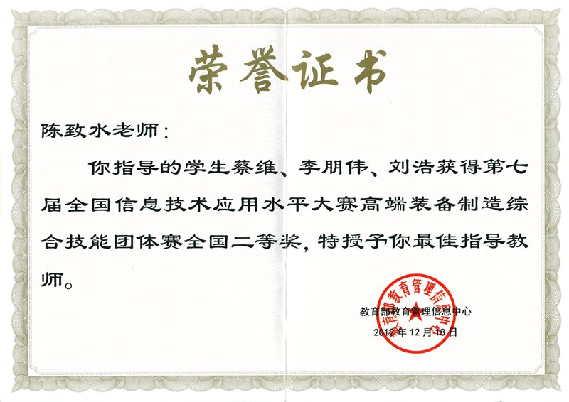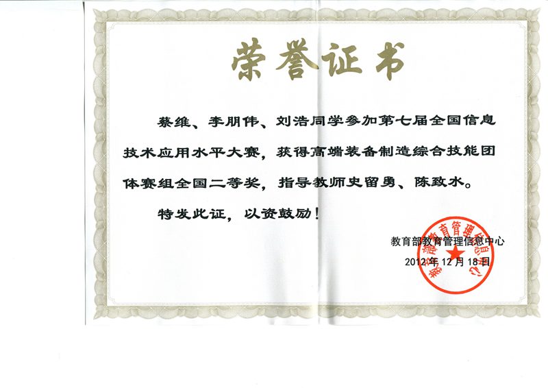 近日,我校必赢626net入口首页师生参加第七届全国信息技术应用水平大赛(高端装备综合制造团体赛)并荣获全国二等奖。该项赛事于2012年5月启动,必赢626net入口首页2010级机械设计制造及其自动化专业蔡维、李朋伟、刘浩等同学组成的团队在老师史留勇、陈致水的指导下,以“全自动椰果脱壳机械装置的设计”为题,在全国初赛1800多份作品中脱颖而出,成功进入了12月16日在北京科技大学举办的全国决赛。在决赛中,经过建模、答辩、作品展示等一系列环节,在强手如林的激烈竞争中最终斩获全国二等奖,史留勇、陈致水荣获“最佳指导教师”称号。颁奖典礼于12月18日在北京大学百年纪念讲堂举行。