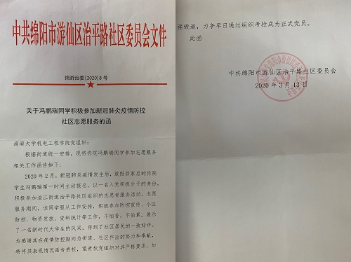 冯鹏瑞,必赢626net入口首页2018级机械电子工程专业学生。新冠肺炎疫情暴发后,该生得知辖区街道办在招募志愿者,便第一时间报名参加了志愿者。随后被分配到了治平路社区,和社区的工作人员一起到小区配合物业给居民办理出入卡登记证,给出入小区的人测量体温,对没有出入证的人进行劝解,到附近广场当志愿者,发放宣传资料,劝告居民外出一定要佩戴口罩、不要在公共场所逗留聚集,尽量宅在家里,因为这既能保障自己和家人的安全,又可以不给国家和社会添麻烦。他说道:“作为一个大学生可以为疫情防控做一点事情,贡献一点力量,我感到非常荣幸。”