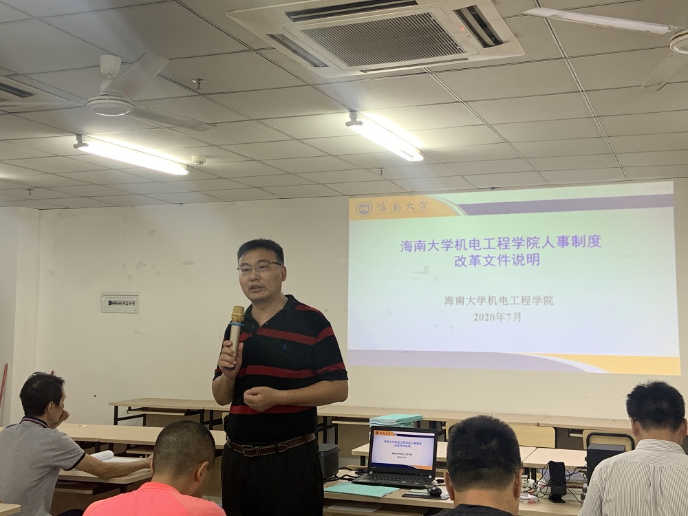 唐院长首先向与会人员传达学校党委会关于人事制度改革的相关精神,介绍学院制定人事制度改革方案的背景与意义,改革的重点与难点,并对相关制度的修订进行了详细的说明。唐院长强调,人事制度改革是学校统一部署推进的一项重要工作,关系到每个教职工的切身利益和未来发展,全院上下要众志成城,齐心协力推进学院人事制度改革。最后,大会表决通过了学院人事制度改革制度方案。