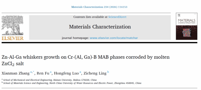 此前,该研究团队还在《Materials Characterization》上发表了题为“Zn-Al-Ga whiskers growth on Cr-(Al, Ga)-B MAB phases corroded by molten ZnCl2 salt”(https://doi.org/10.1016/j.matchar.2026.116153)的研究性论文,发现了Cr-(Al, Ga)-B MAB相固溶体与ZnCl2熔盐反应后会形成Cr-(Al, Zn, Ga)-B MAB相固溶体并自发Zn(Al, Ga)等复杂晶须。
